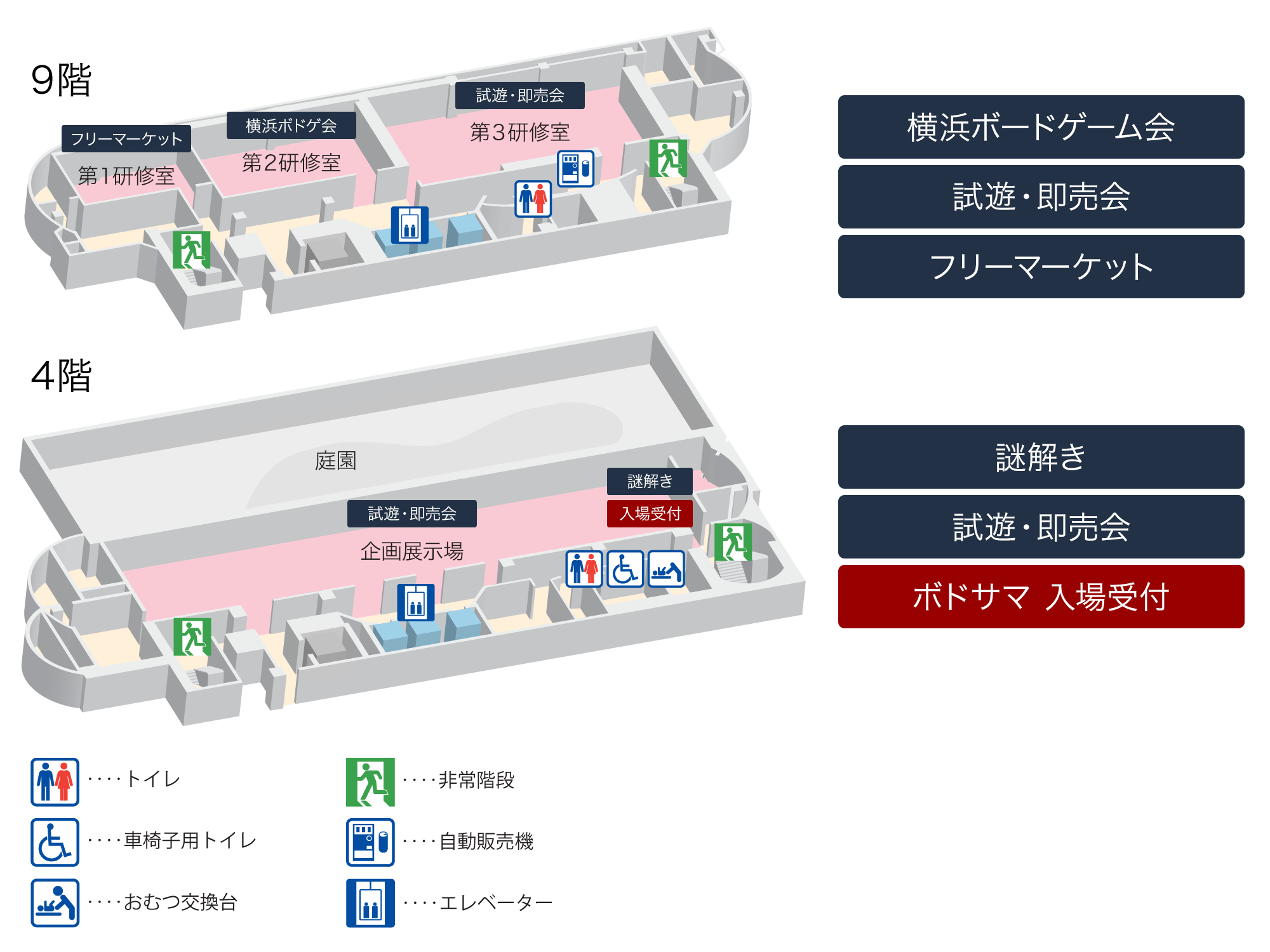 ボドサマ2026は、4階と9階の2フロアで開催します。移動の際はエレベーターをご利用ください。